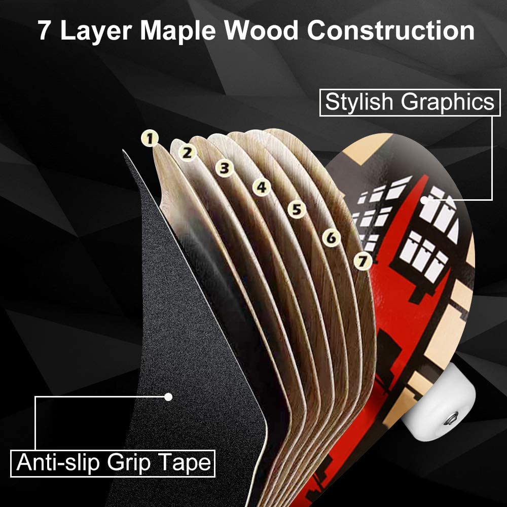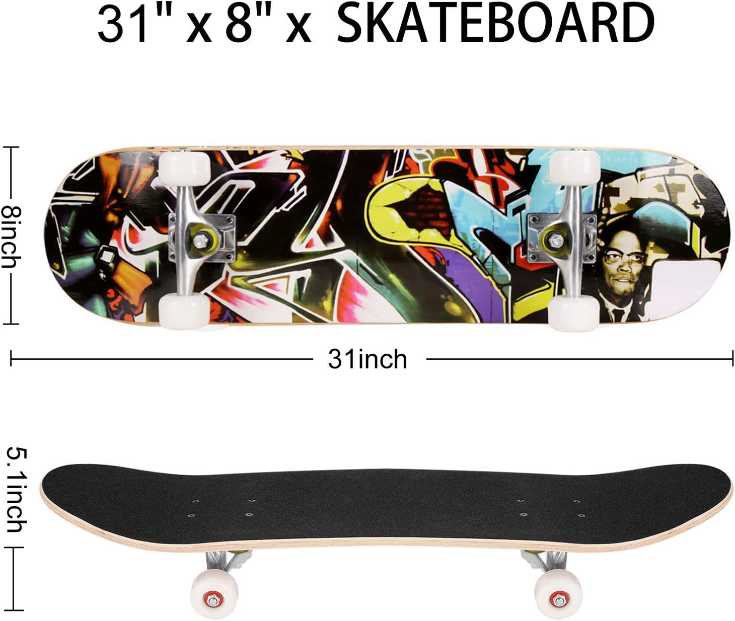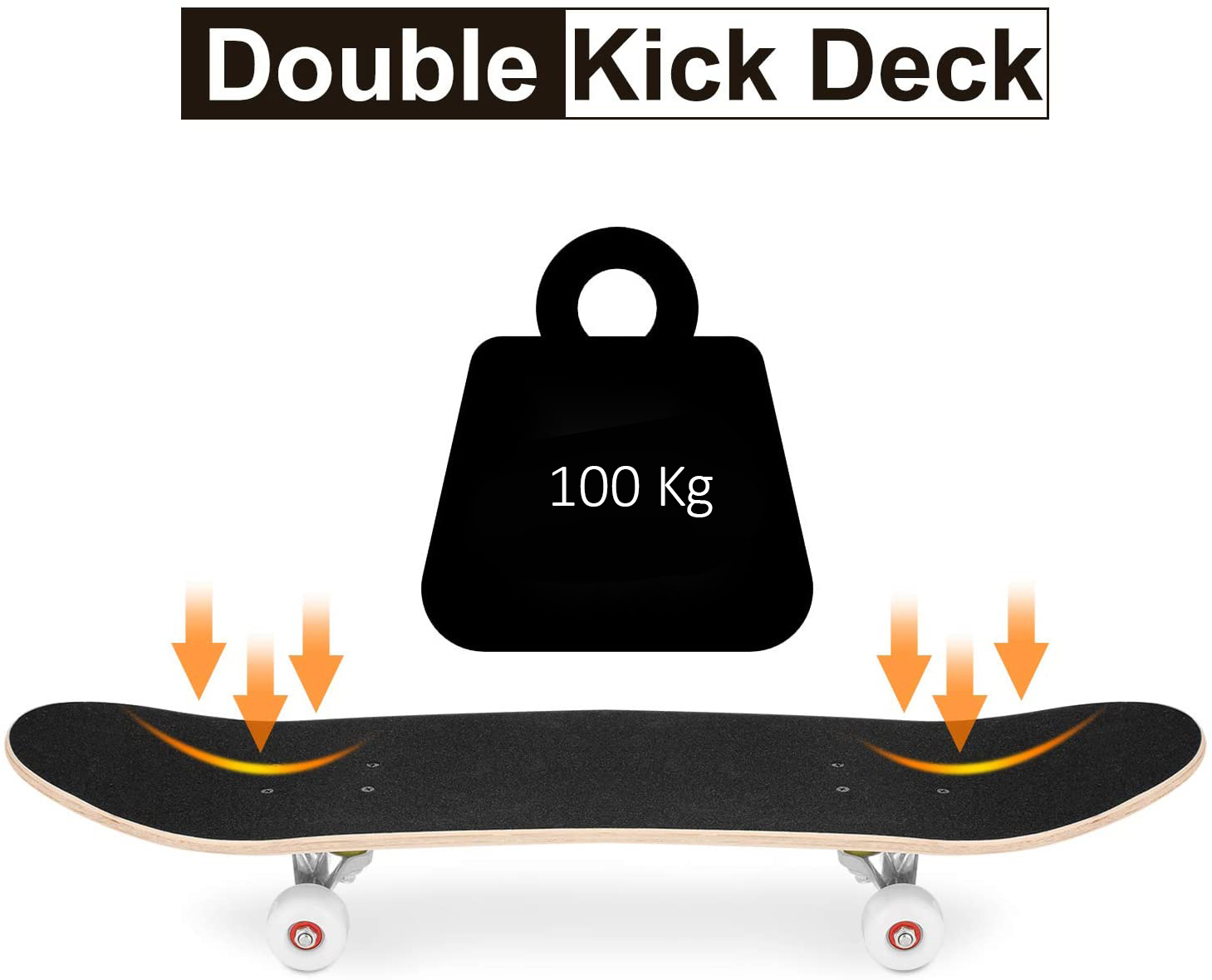 Adequado para skaters de rua, skate parques, rampas, piscinas e outras superfícies lisas ou até terreno irregular. Seguro e duradouro: construção com 7 camadas de madeira de ácer e plataforma com sola prensada para durabilidade e leveza, e para garantir a forma ideal. Até 100 kg, uso seguro para adolescentes e adultos. Rodas de poliuretano de alto impulso de 85 a 50 mm, e um rolamento de aço cromado de alta velocidade ABEC-7 super silencioso com aderência forte e absorção de impactos. Montado e pronto para tirar da caixa e testar na estrada. 79 cm de comprimento x 20 cm de largura. Côncavo de dupla pernada: desenho côncavo de dupla pernada, ótima jogabilidade. Impressão duradoura e harmoniosa: o desenho da cor e dos gráficos na plataforma são muito criativos e atrativos.