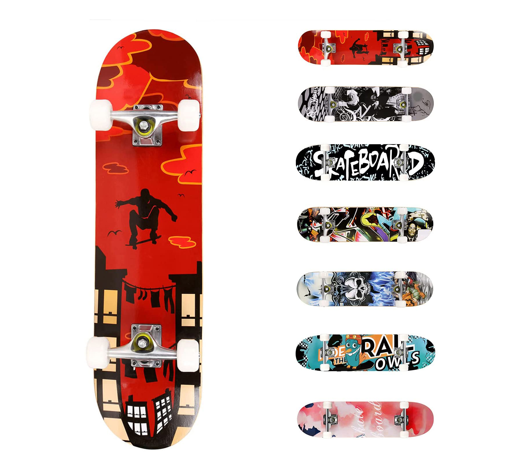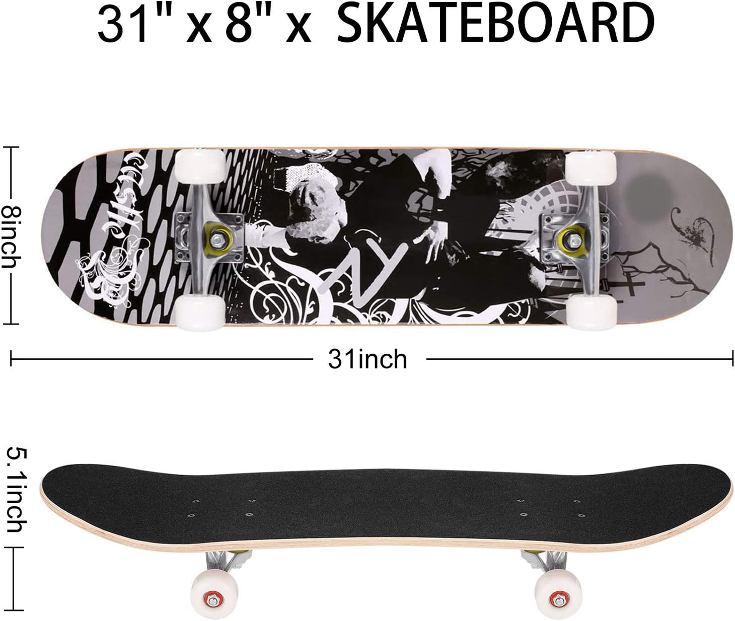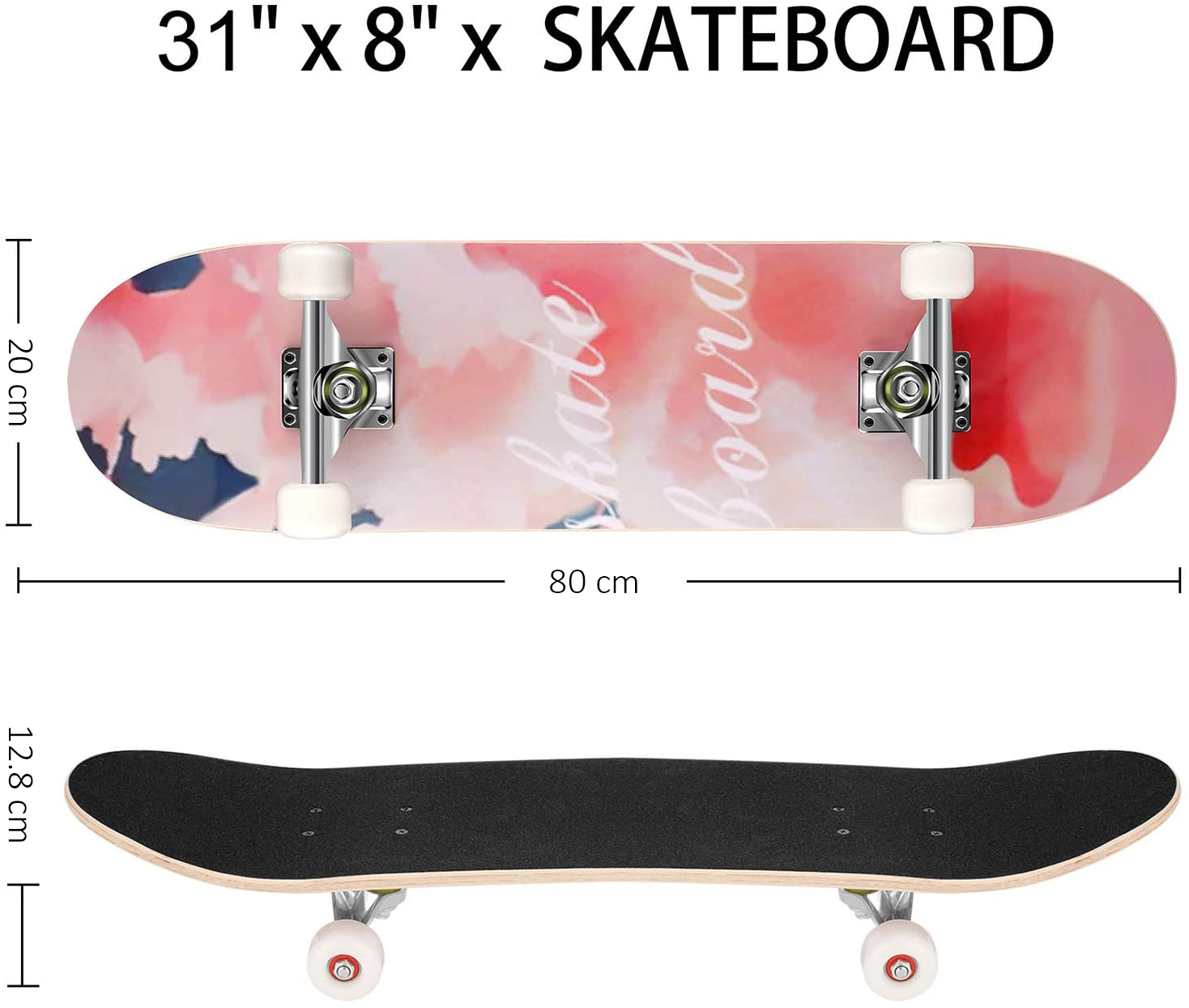 Adequado para skaters de rua, skate parques, rampas, piscinas e outras superfícies lisas ou até terreno irregular. Seguro e duradouro: construção com 7 camadas de madeira de ácer e plataforma com sola prensada para durabilidade e leveza, e para garantir a forma ideal. Até 100 kg, uso seguro para adolescentes e adultos. Rodas de poliuretano de alto impulso de 85 a 50 mm, e um rolamento de aço cromado de alta velocidade ABEC-7 super silencioso com aderência forte e absorção de impactos. Montado e pronto para tirar da caixa e testar na estrada. 79 cm de comprimento x 20 cm de largura. Côncavo de dupla pernada: desenho côncavo de dupla pernada, ótima jogabilidade. Impressão duradoura e harmoniosa: o desenho da cor e dos gráficos na plataforma são muito criativos e atrativos.