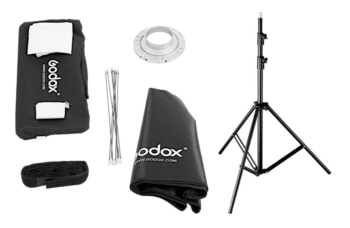 O design do softbox é baseado em um anel metálico que é uma faixa elástica, responsável por uma tensão forte e um uniforme de fundo.