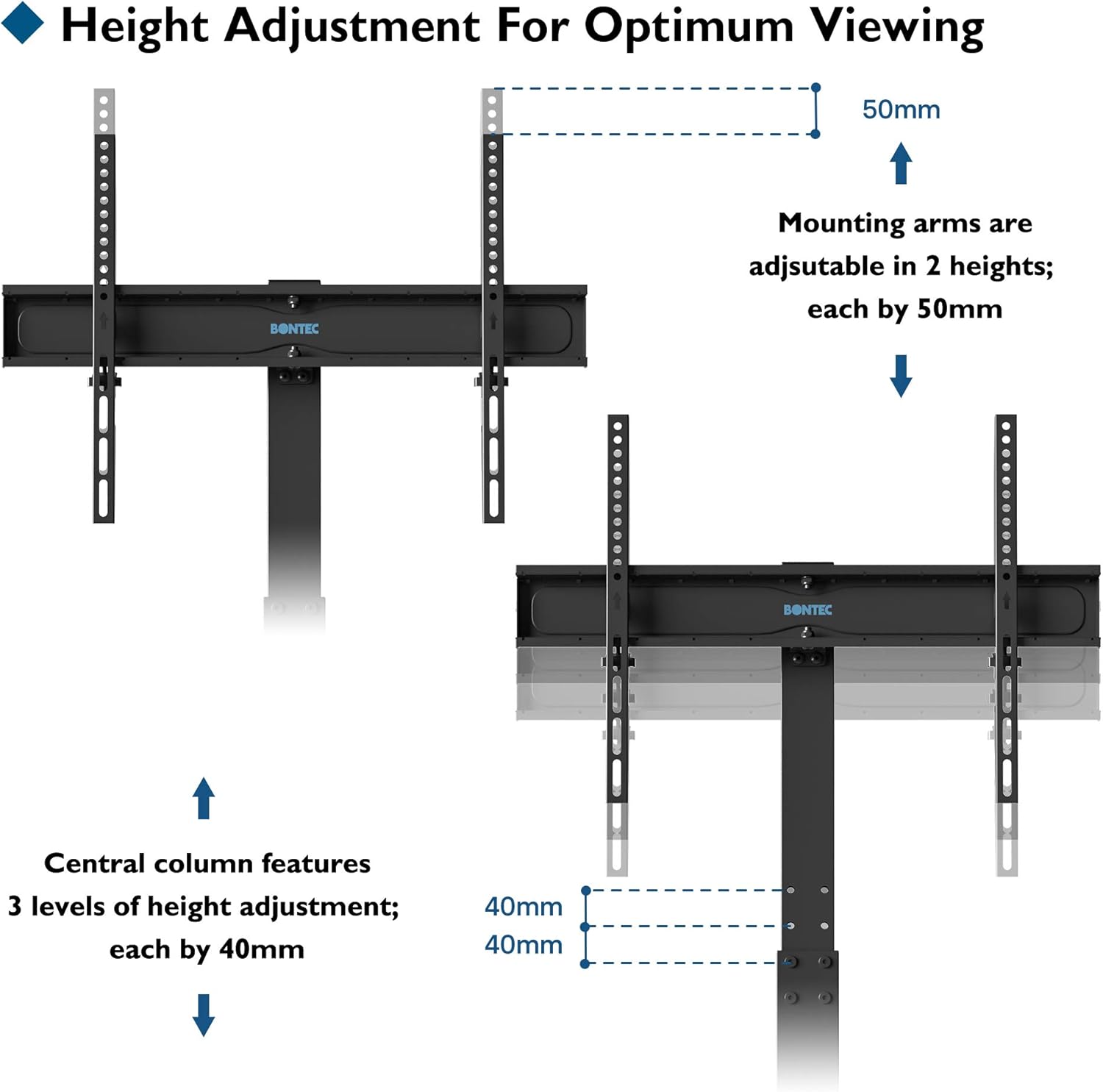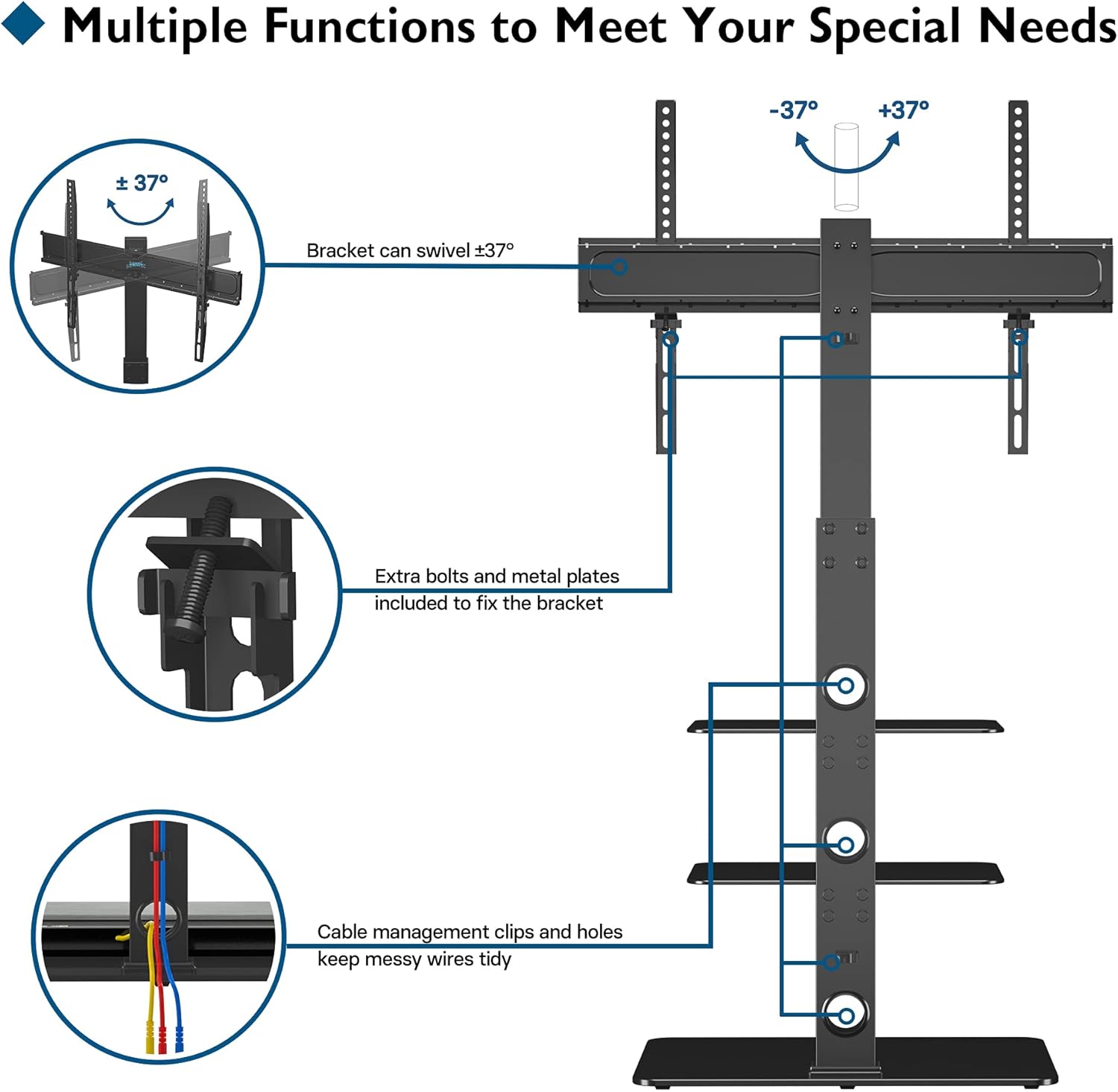Suporte de pé para TVs de 30" a 70", compatível com padrões VESA até 600x400 e com capacidade máxima de 40 kg. Possui estrutura metálica reforçada para maior estabilidade. Oferece rotação de 37° e 6 níveis de ajuste de altura para melhor ergonomia. Inclui três prateleiras de vidro temperado (capacidade 60/10/10 kg) para equipamentos adicionais. Conta ainda com sistema de gestão de cabos e pés antiderrapantes. A montagem é simples, com todo o material incluído, e a manutenção é fácil graças às superfícies de vidro e metal.
