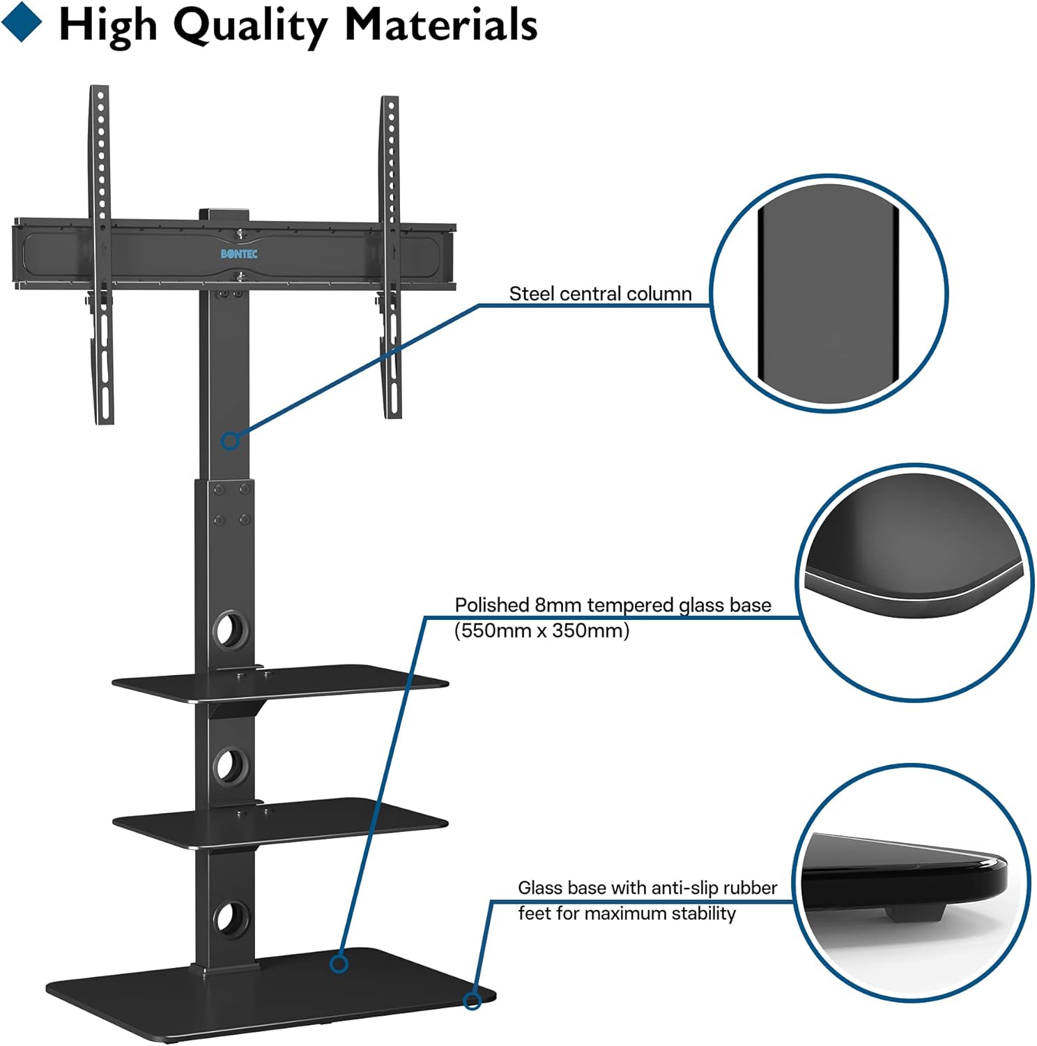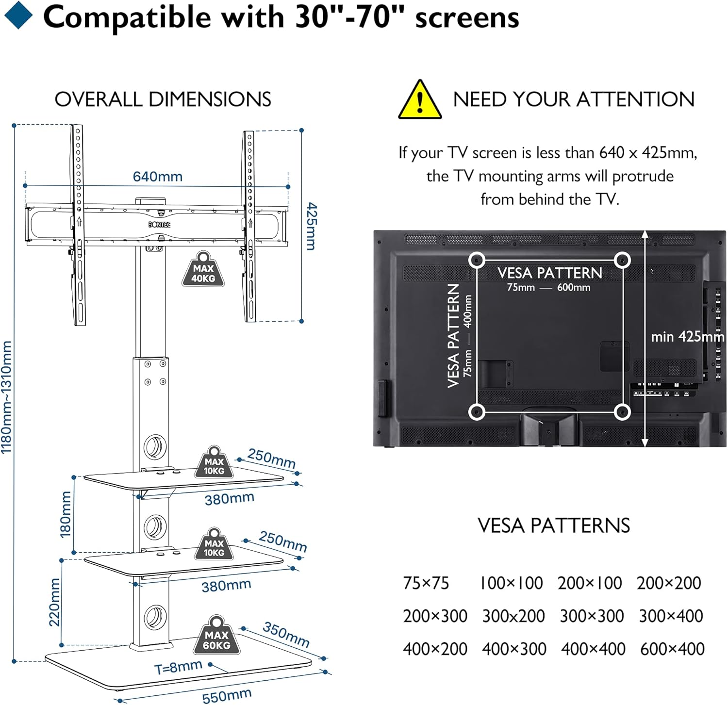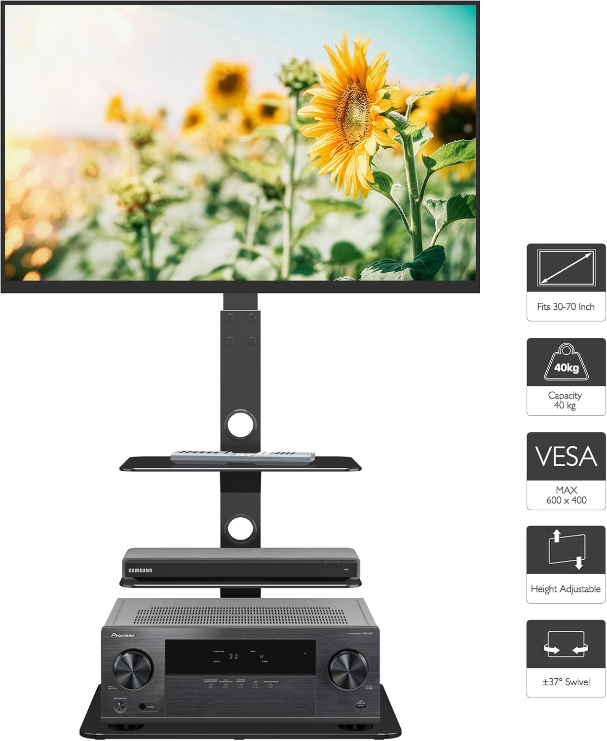 Suporte de TV de chão 30 a 70 polegadas até 40 kg, altura ajustável, prateleiras de vidro temperado de 3 níveis