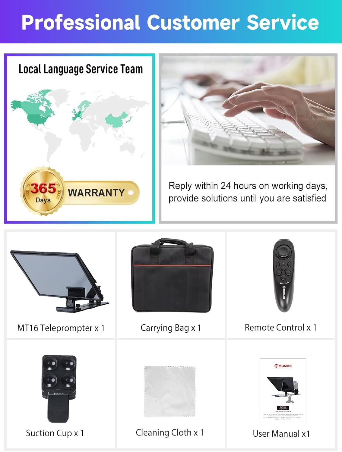 Ultra HD de 16 polegadas, recusa NG: o teleprompter Moman MT16 renova o vidro refletor com um grande vidro divisor de feixe de 16 polegadas, que reflete claramente a escrita e proporciona uma faixa de leitura de até 5 m. Reduza a frequência NG e melhore a eficiência do trabalho com o MT16 Prompter!