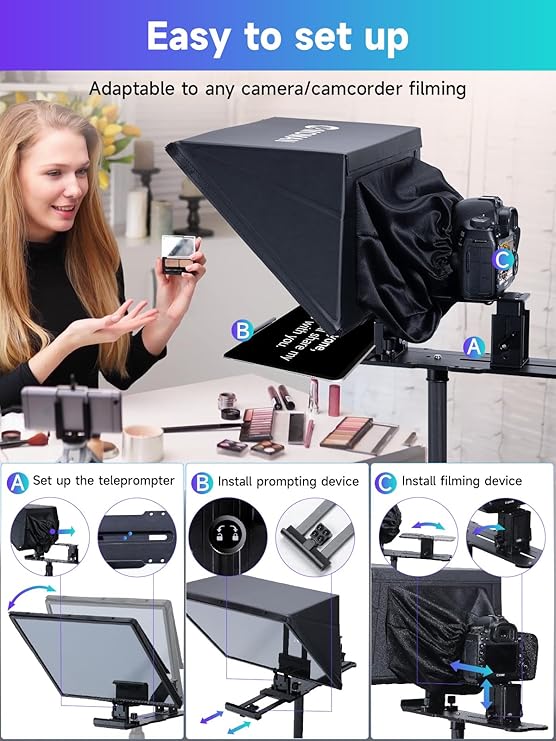 Compatível com a maioria dos tablets/telemóvel: para ser compatível com vidro refletor de grandes dimensões, o telepronter de vídeo Moman MT16 atualiza o suporte de braçadeira ajustável para Max. Largura 29 cm, compatível com a maioria dos tablets e telemóveis do mercado (também inclui uma ventosa para uma colocação segura).