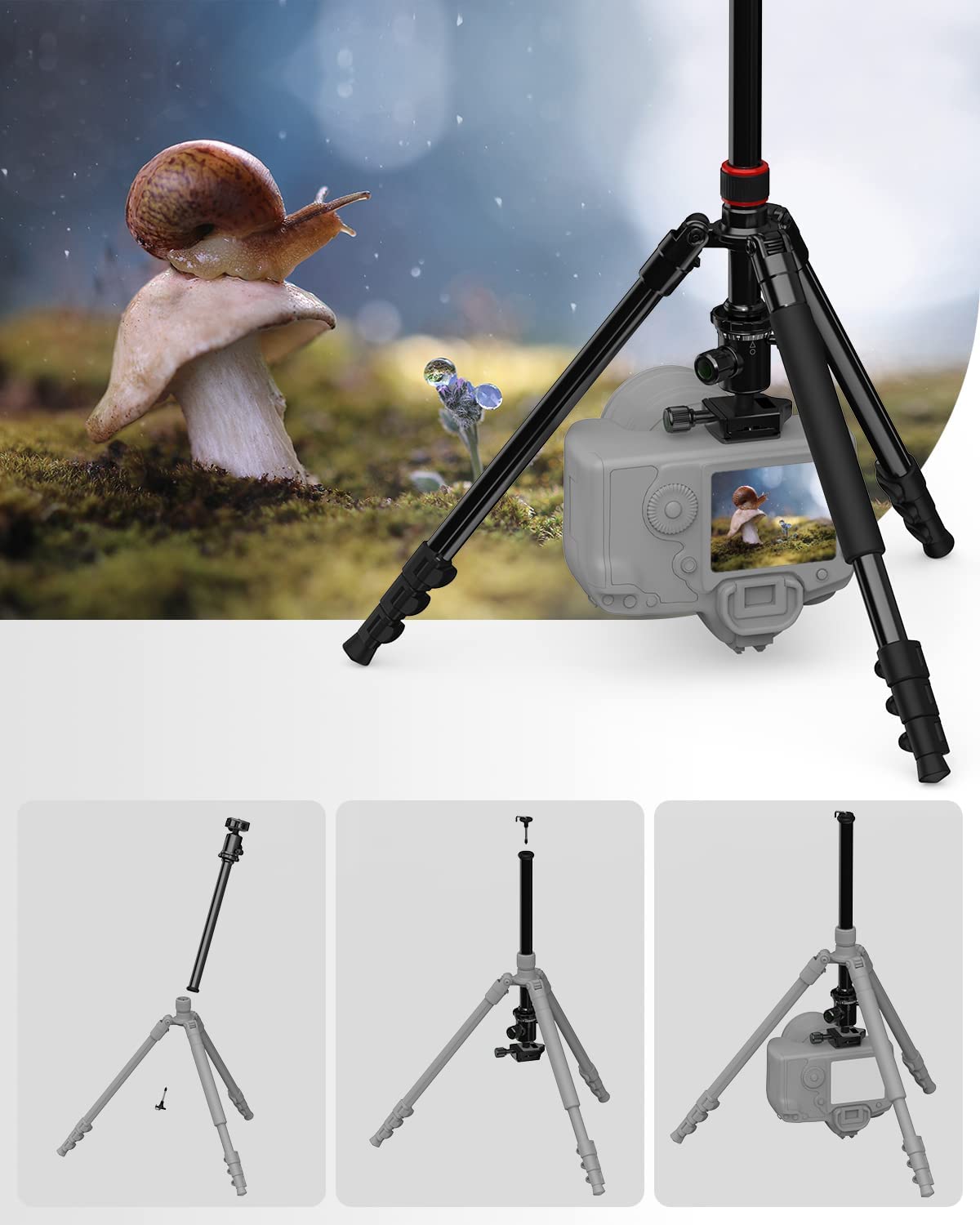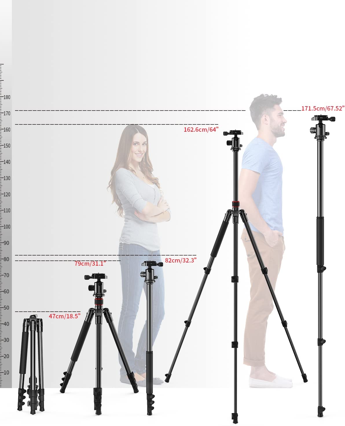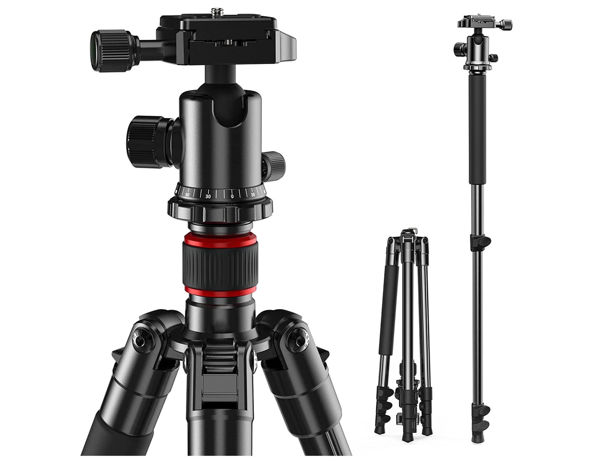 Leve e resistente. Dobra-se facilmente até um comprimento de 45 cm e pesa apenas 1,3 kg. O seu corpo de alumínio robusto pode suportar até 6 kg de equipamento fotográfico, mesmo com lentes teleobjetivas. Ideal para vídeo, fotógrafos, Youtube, videoblogging, streaming, etc. Cabeça panorâmica estável e suave com ajuste de ângulo livre para disparos panorâmicos a 360°. A perna da coluna segmentada com bloqueio de desbloqueio rápido permite ajustar a altura de trabalho de 43 cm a 157 cm. Qualquer uma das pernas pode ser usada como um monopé de até 198 cm ou braço extensível. As pernas do tripé também podem ser viradas e dobradas 180 graus, economizando 43 cm de espaço. Fácil de transportar.