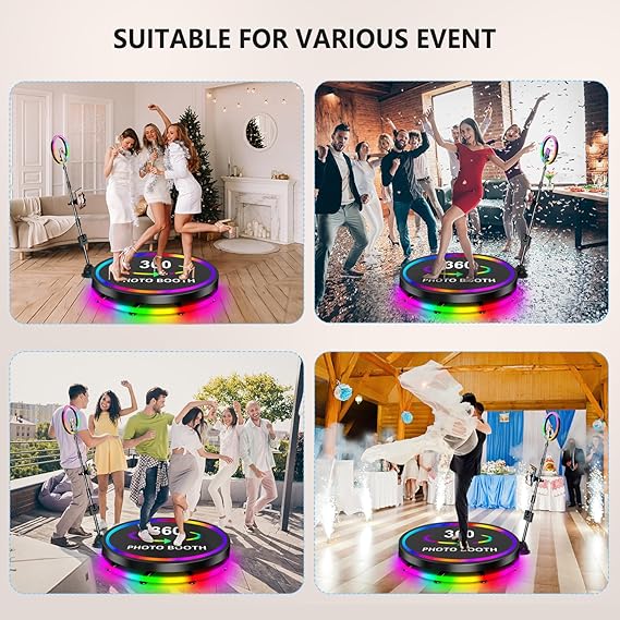 Controlo sem fios para fotografar sem esforço: assume o controlo total da velocidade de rotação da cabine usando o controlo remoto incluído, girando-o sem esforço no sentido horário ou anti-horário para fotografar. O cenário aprimorado para cabine fotográfica de 360 graus vem com luzes RGB; melhore a atmosfera usando o controlo remoto incluído para alternar entre os seus efeitos de cor favoritos.